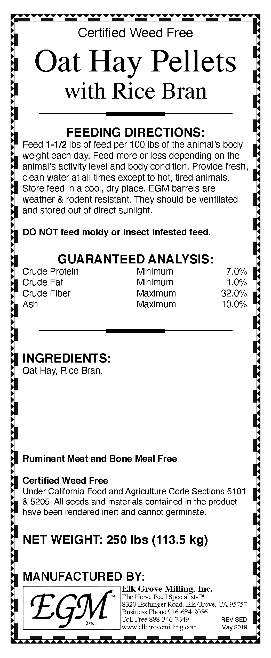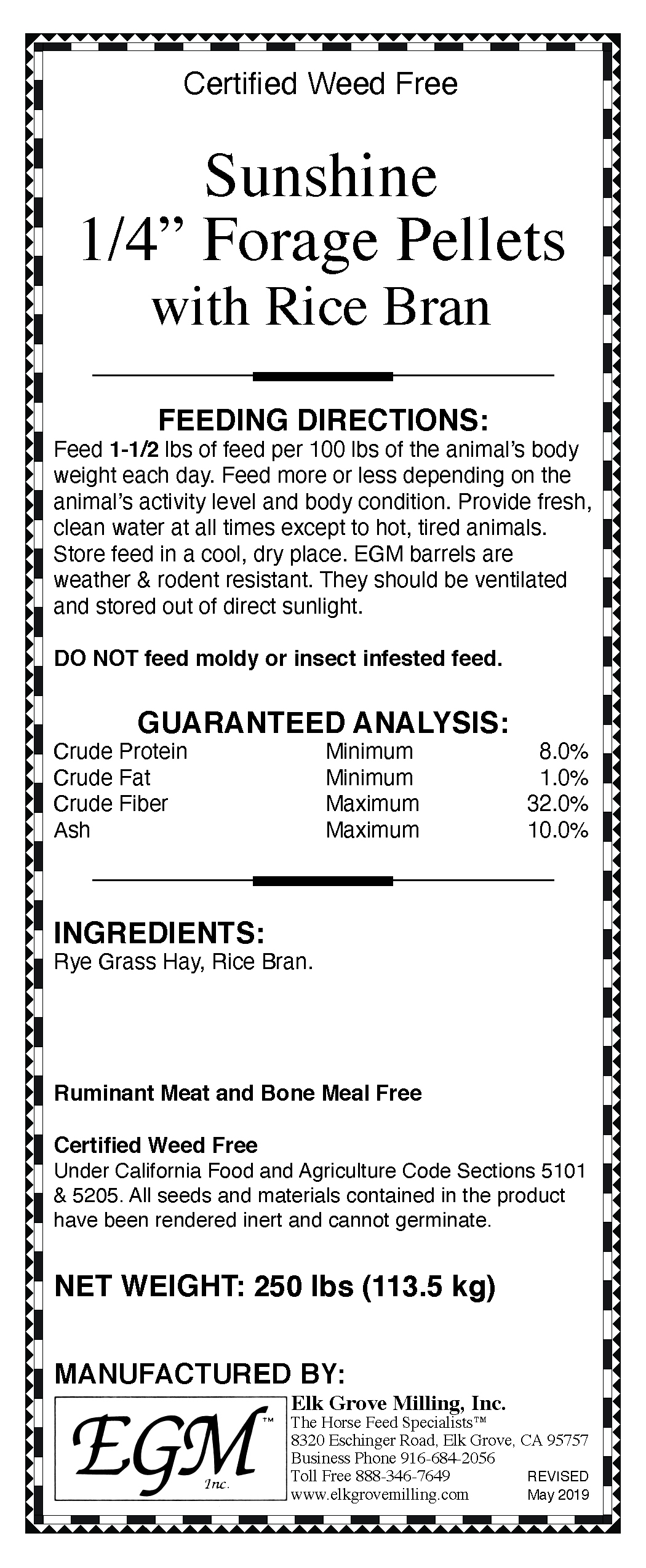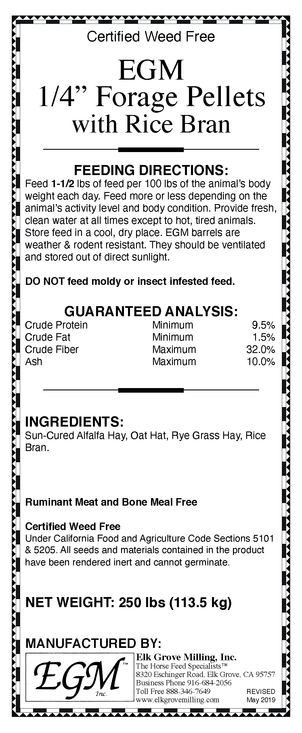 For all forage products feed 1-1/2lbs per 100lbs of animal’s weight each day, depending on the animal’s activity level and body condition. Provide plenty of fresh, clean water at all times except to hot, tired animals. Store in a cool dry place.