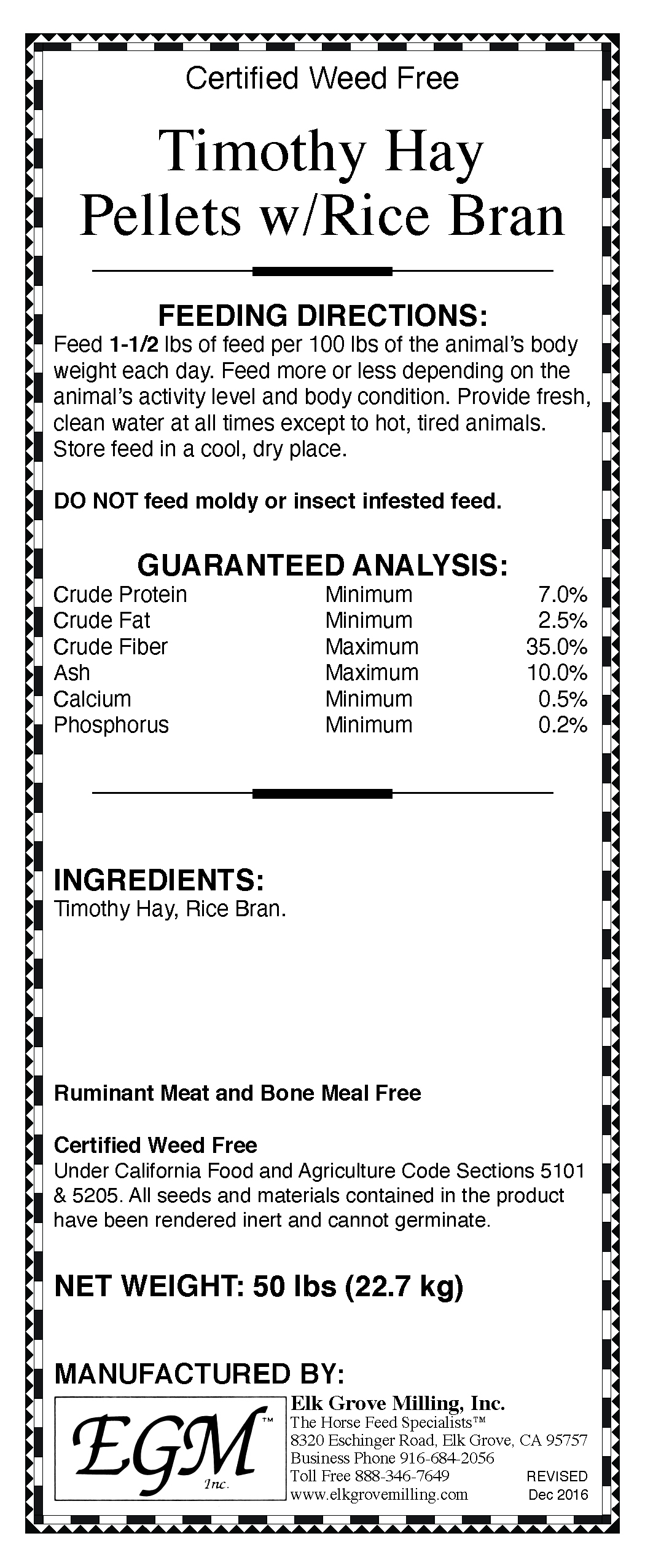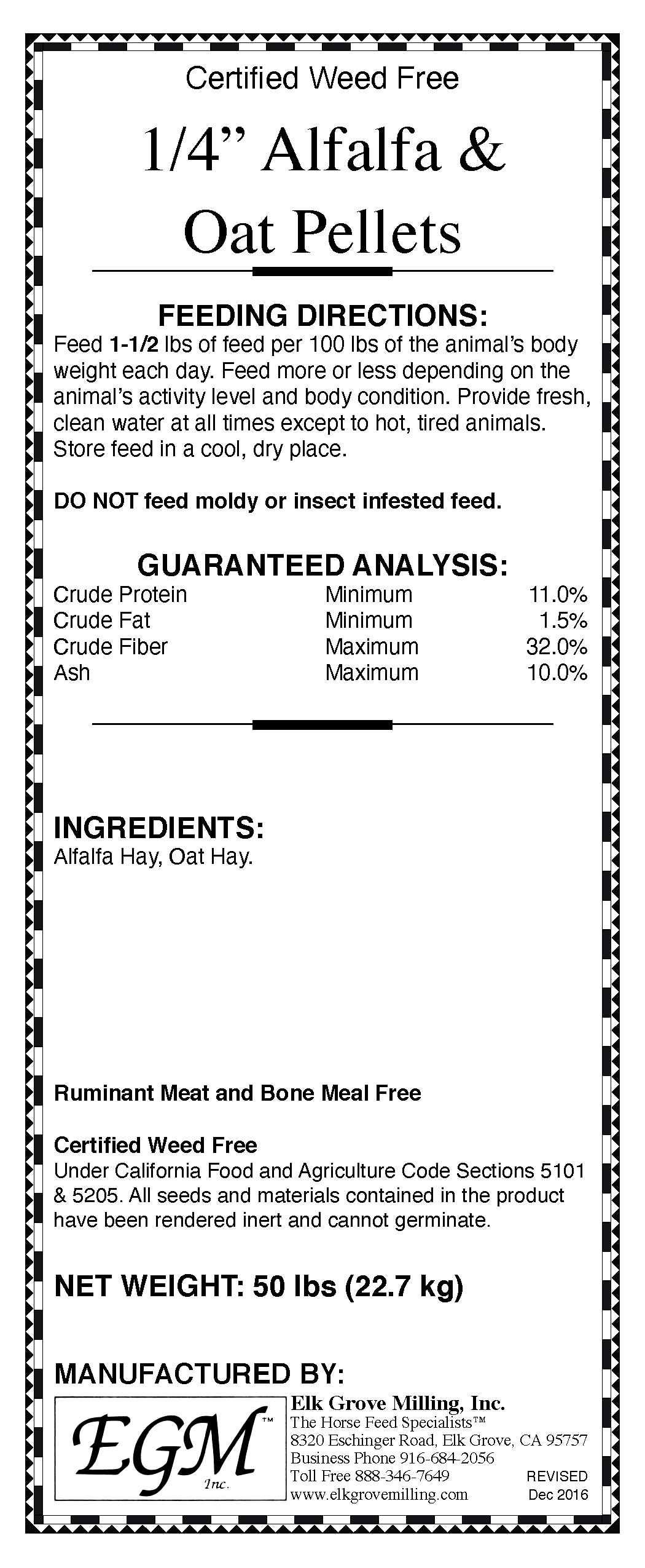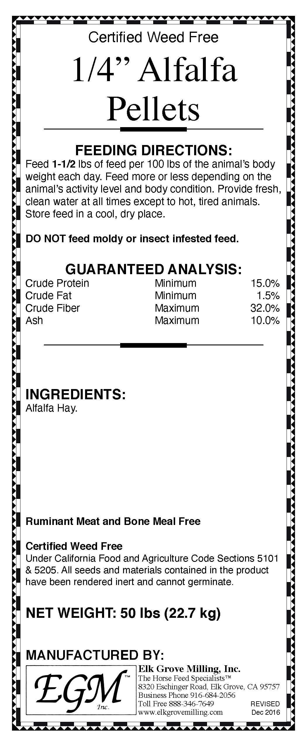 For all forage products feed 1-1/2lbs per 100lbs of animal’s weight each day, depending on the animal’s activity level and body condition. Provide plenty of fresh, clean water at all times except to hot, tired animals. Store in a cool dry place.