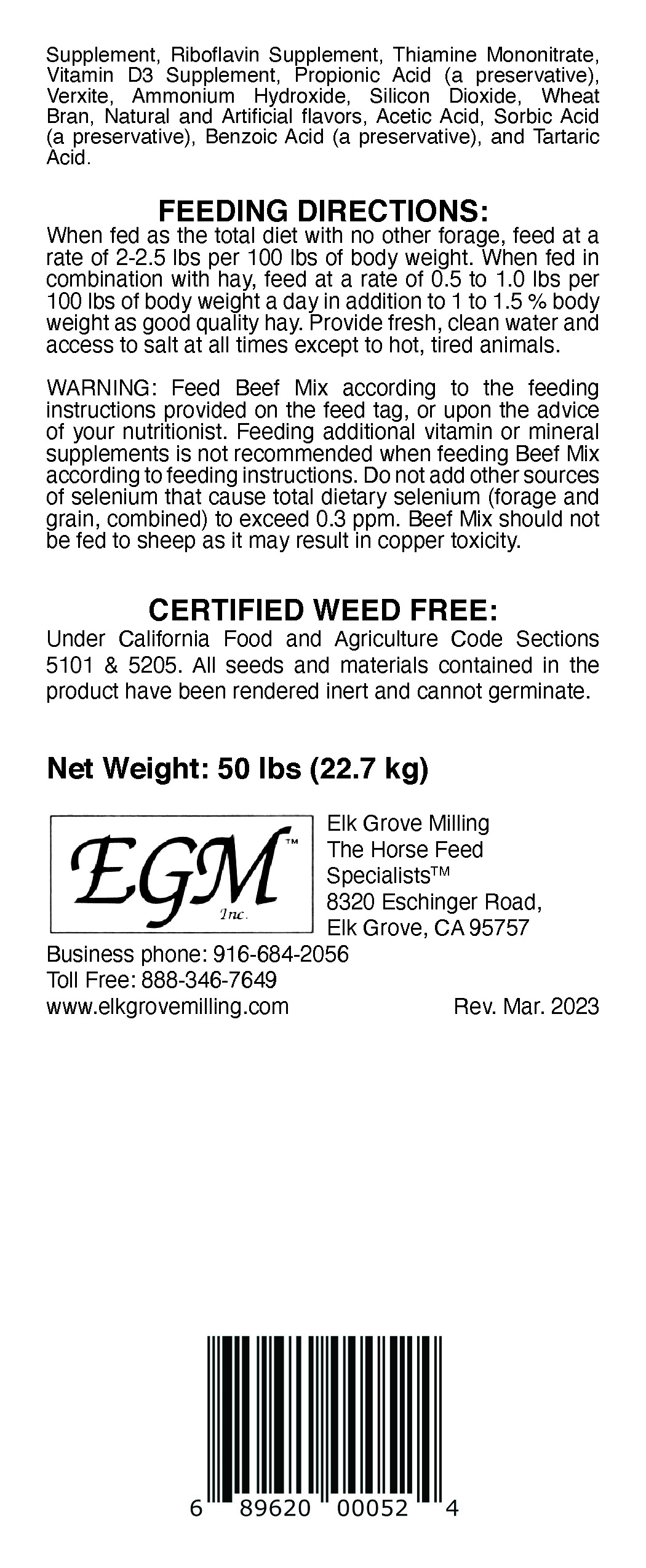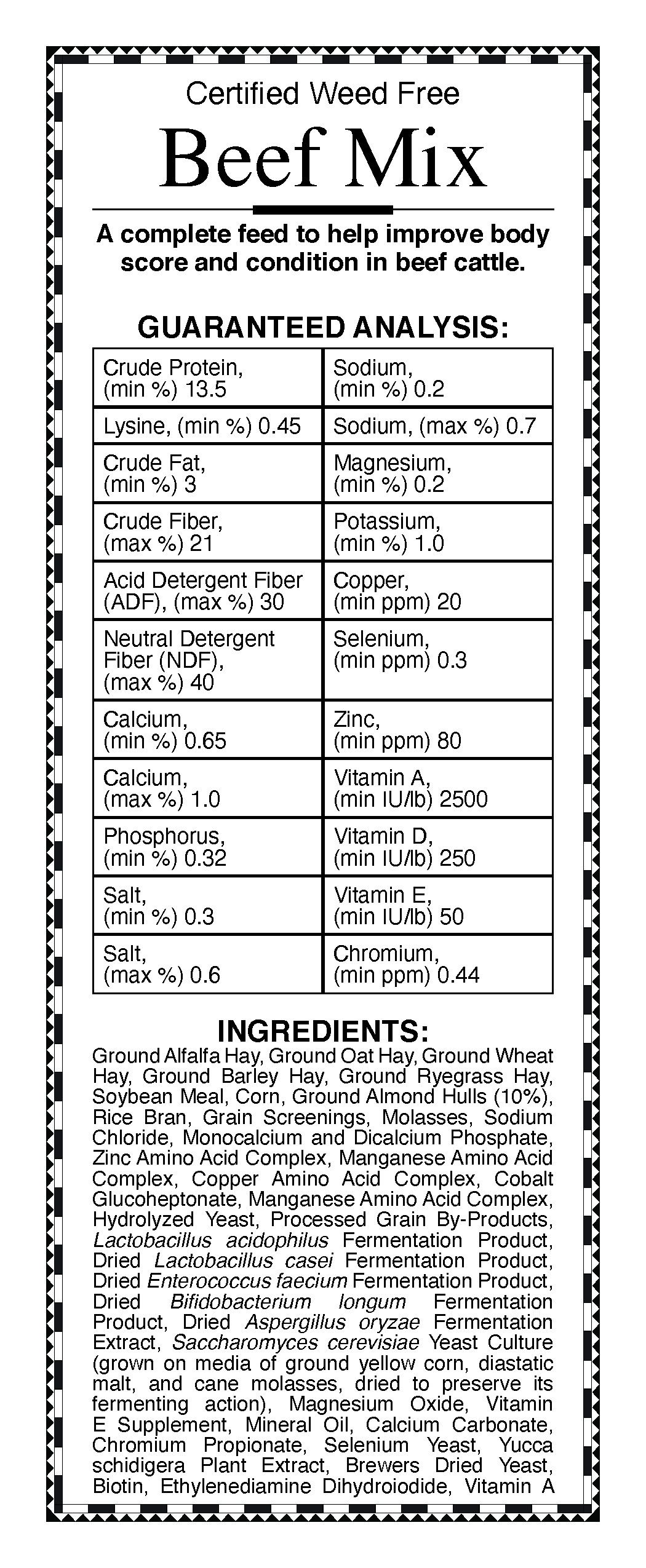 Unlike hay, Beef Mix comes with all the necessary vitamins and minerals to insure all of your cattle get their daily nutritional needs met. We don’t just use any minerals we use Zinpro Performance Minerals. These patented organic minerals are unique in the market place. For more information on Zinpro minerals visit their website at www.zinpro.com