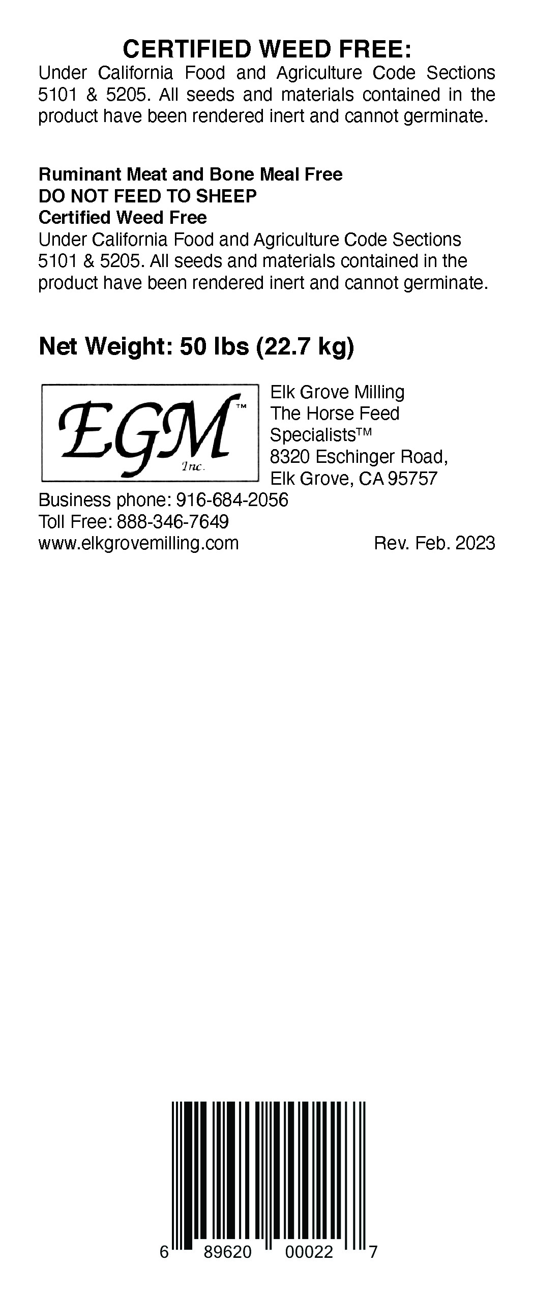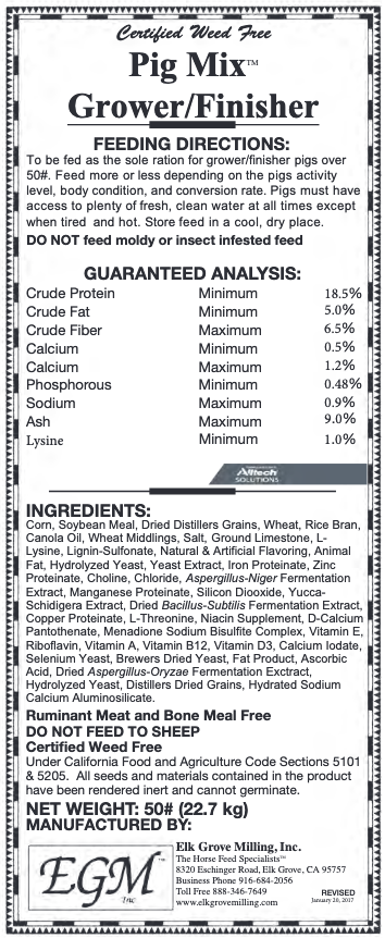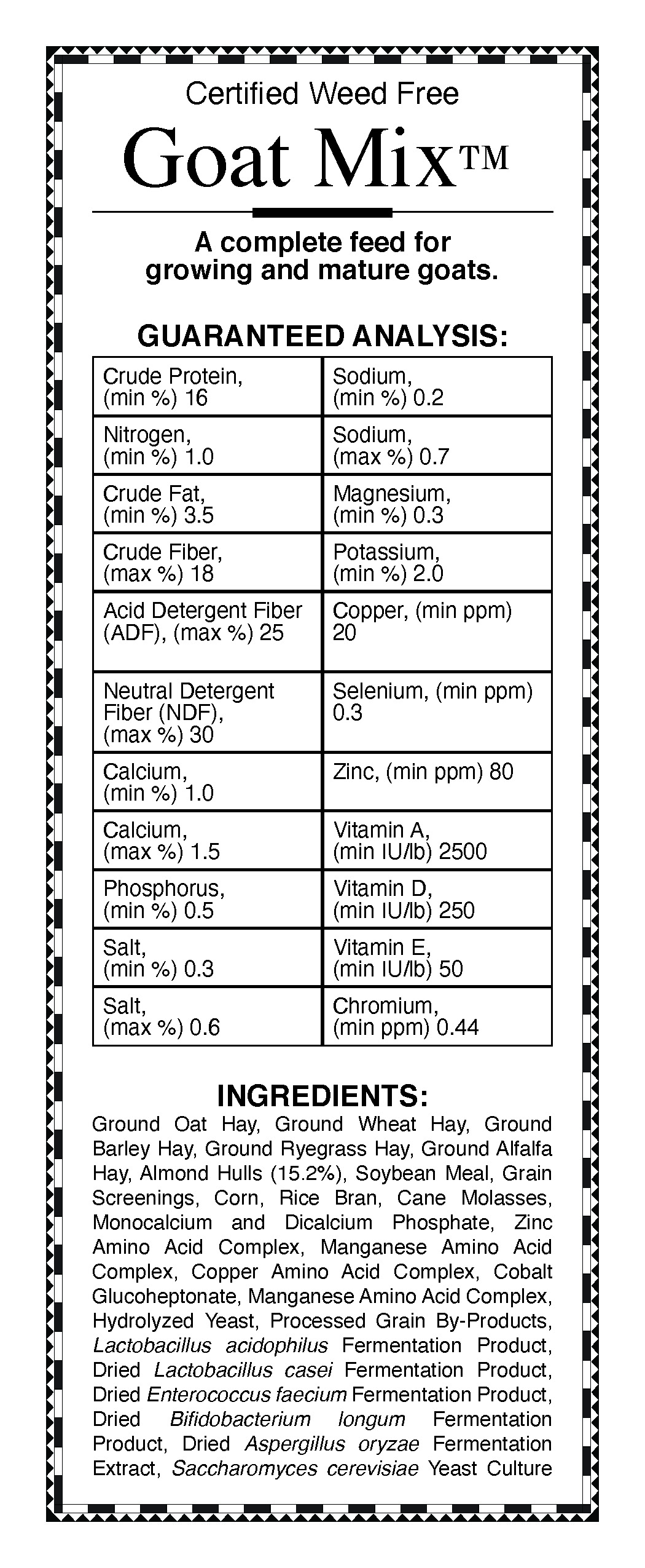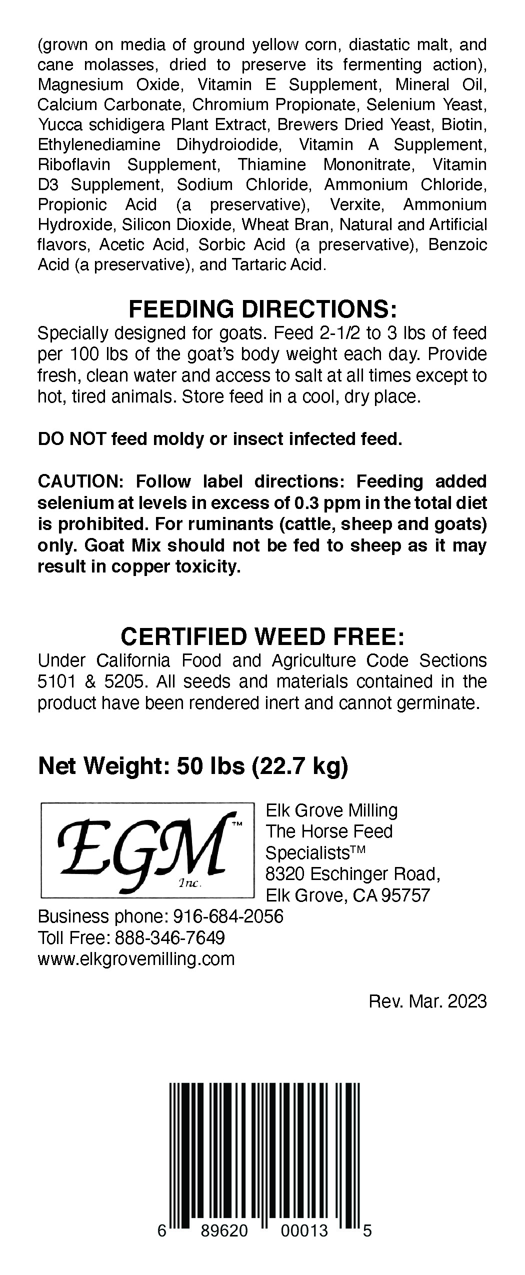 Elk Grove Milling, Inc.’s Goat Mix is a 16% protein complete feed in a 5/32″ pellet. Our Goat Mix is formulated to be the sole ration provided, fed at 2.5-3# per 100# of a goat’s body weight per day. No additional supplements or top dresses are needed- Goat Mix contains all the vitamins and minerals your goat needs- PLUS no more wasted hay or sorting supplements in the trough!