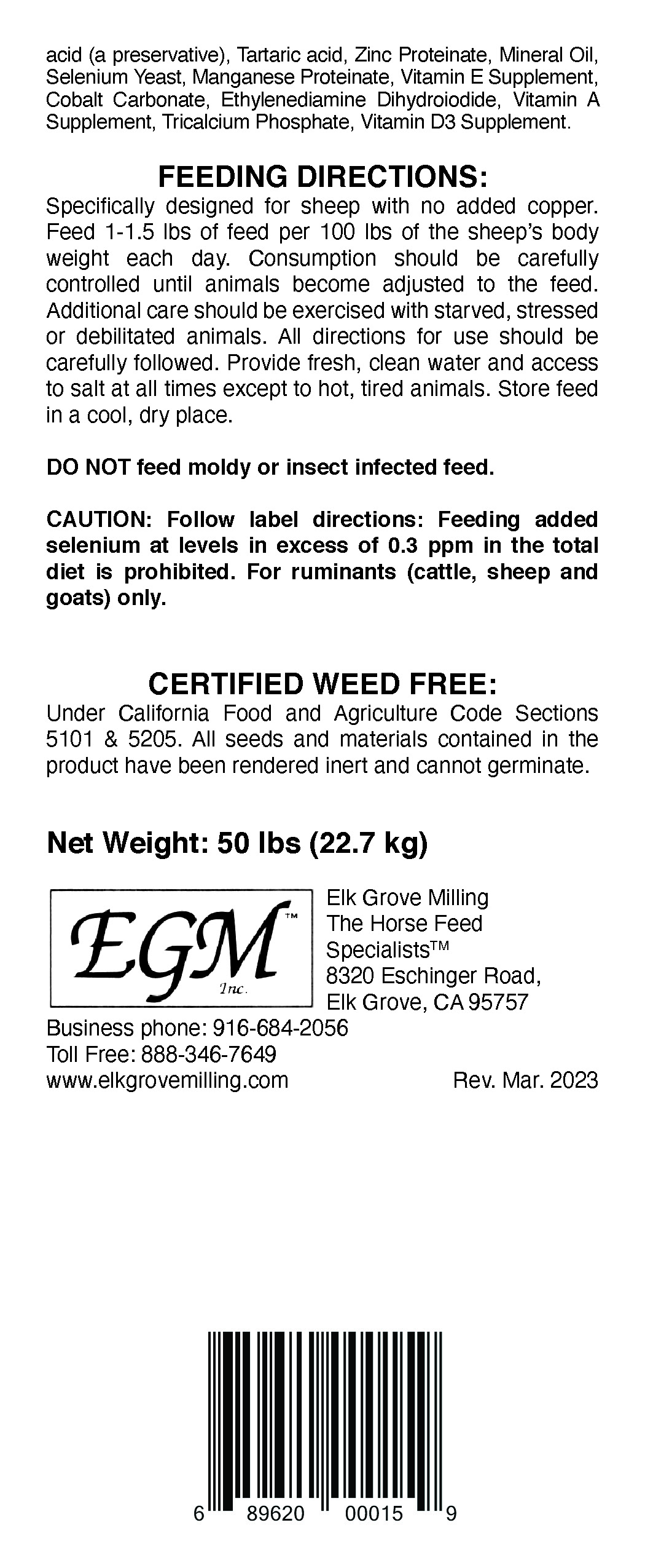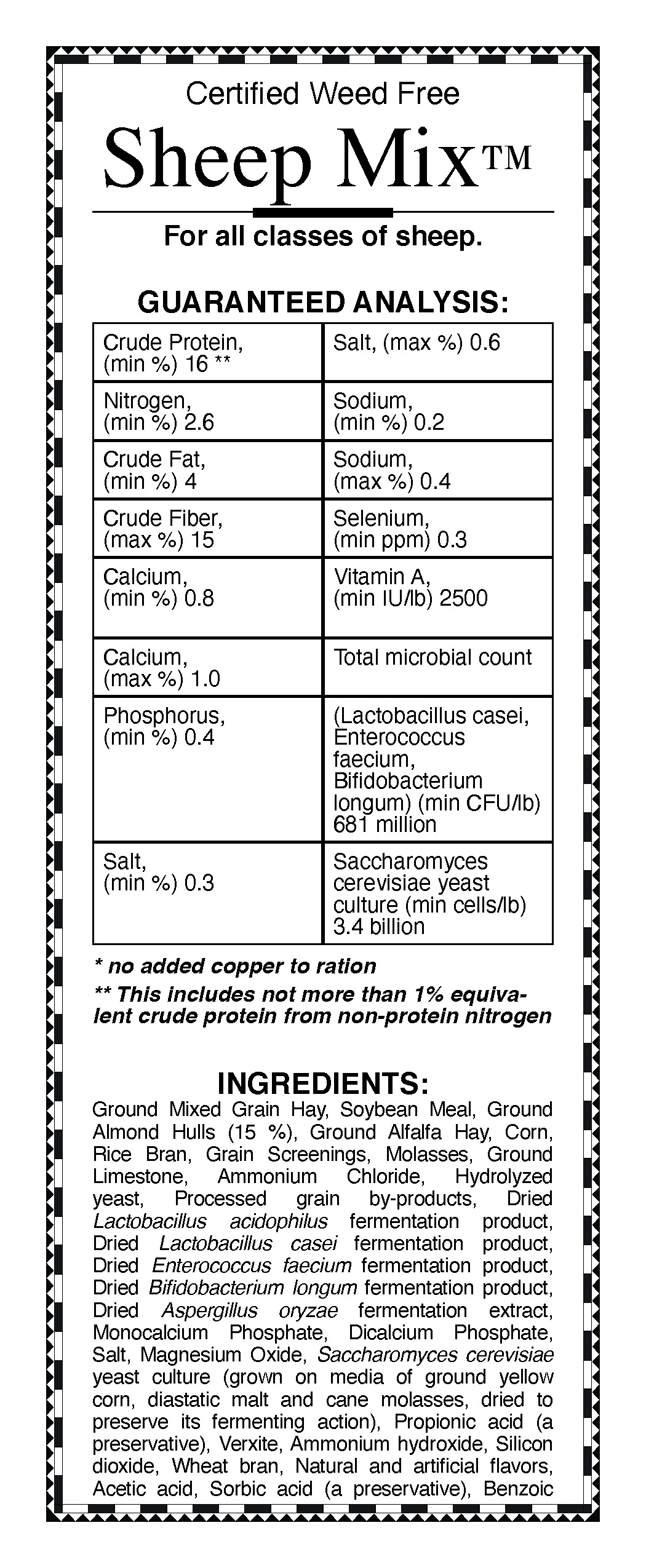 Sheep Mix is a complete pelleted feed that contains all the daily requirements of vitamins and Zinpro minerals sheep need with no added copper. Sheep Mix is specially formulated for sheep with 16% protein, 3% fat and is a 5/32” pellet that is easier for the sheep to eat. Can be fed to goats.