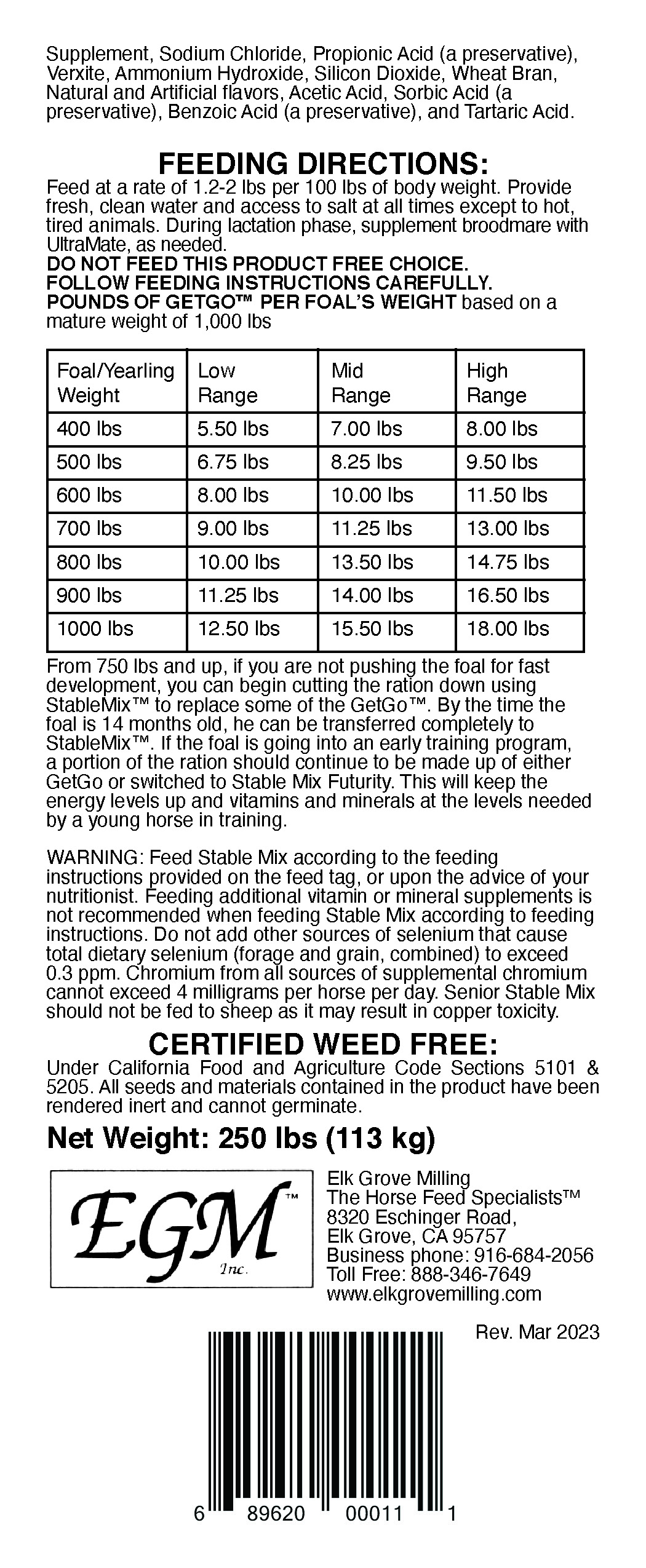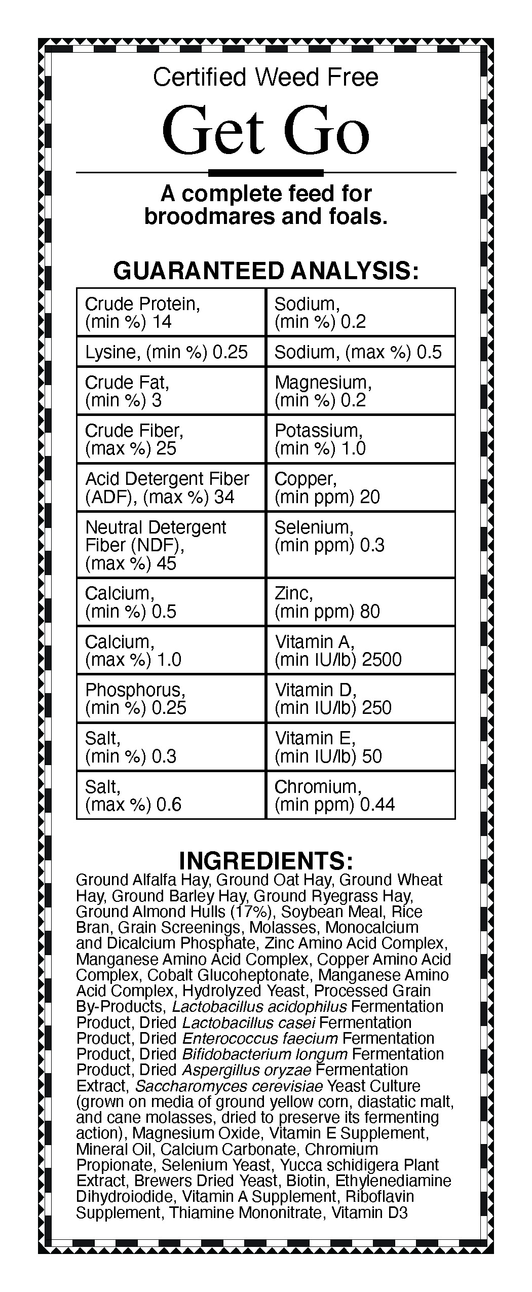 Get Go is a balanced pelleted feed formulated for weanlings up to 18 months. Get Go is designed to be fed as a complete source feed by blending quality hay, vitamins, and Zinpro minerals. Get Go will promote optimal growth and development of your foals. Get Go can help prevent OCD and epiphysitis if fed as complete feed. Feeding alfalfa hay with this product is not recommended. Get Go contains Zinpro. These minerals are essential in the health of your young horse, improving bone development, proper joint development, hoof growth, coat condition, immune response, and feed digestibility.