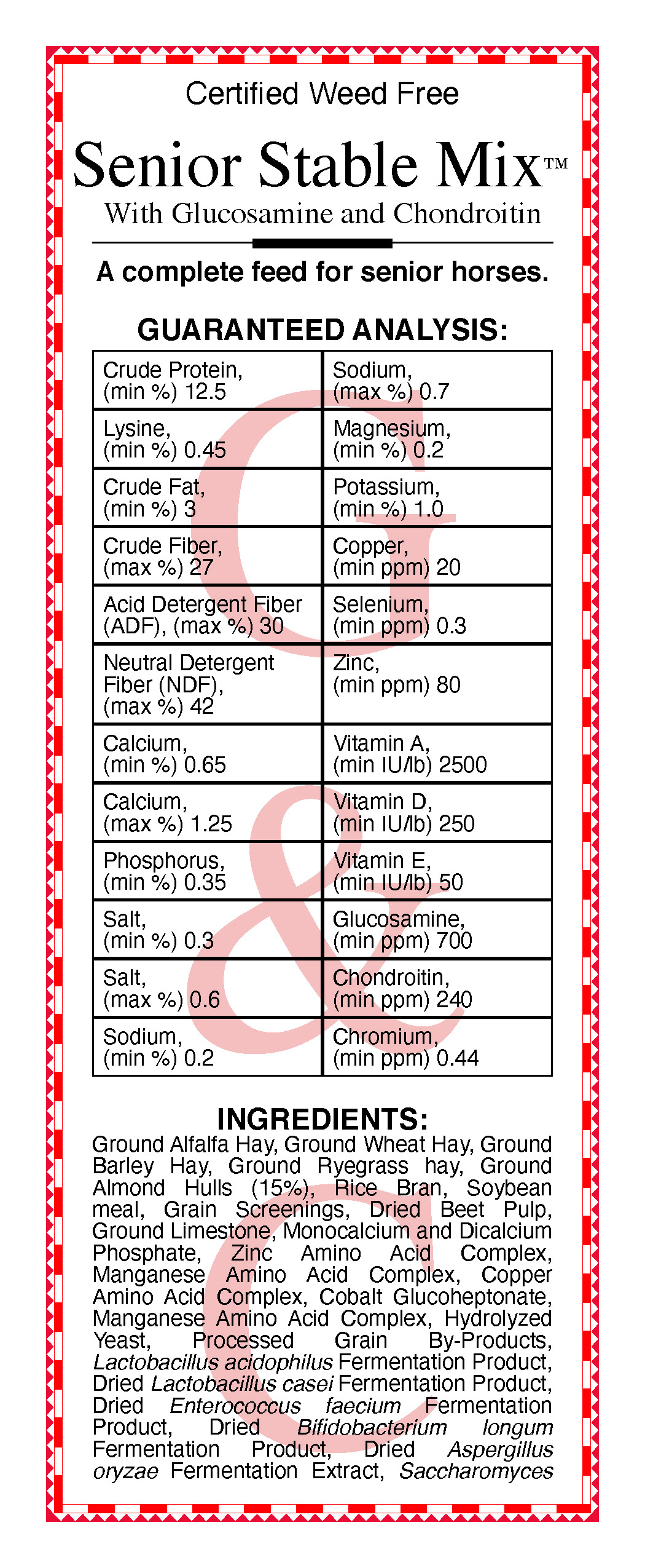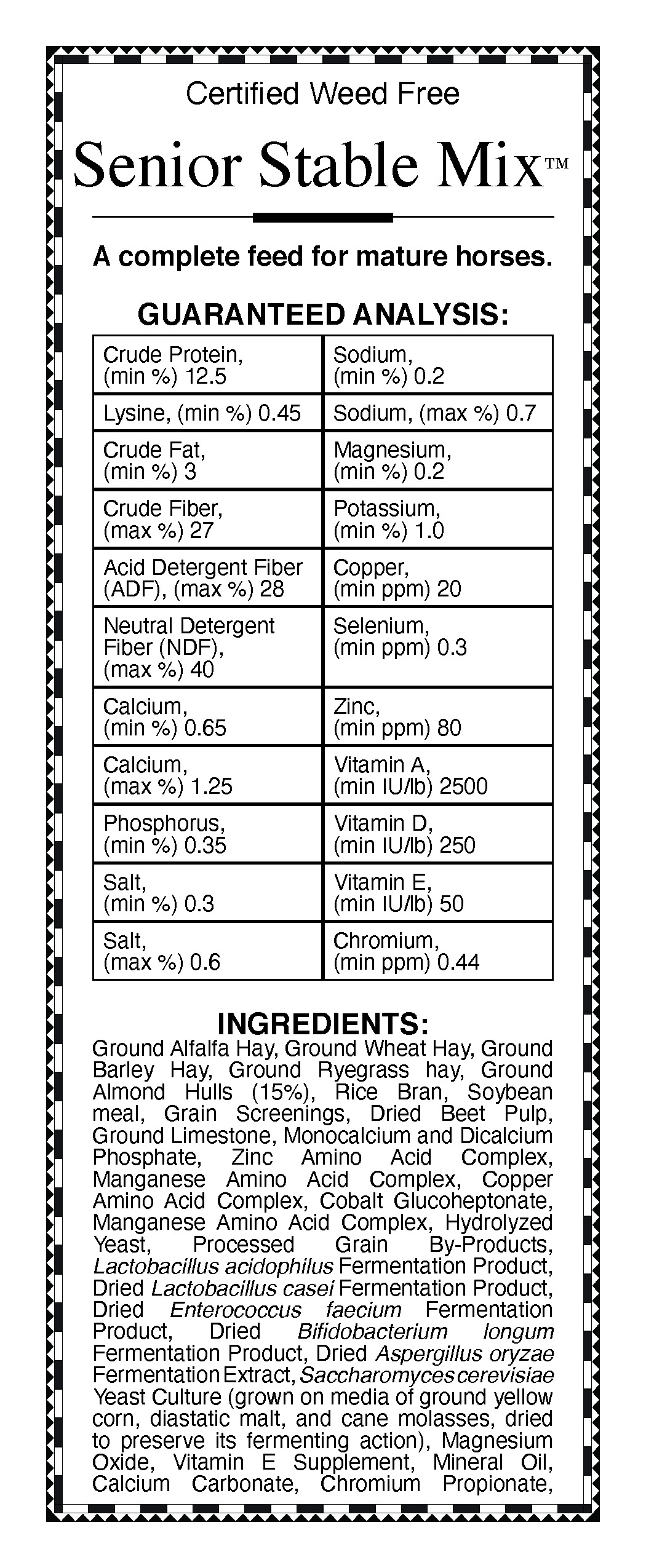 For those special friends who have entered their golden years, or hard keepers, Senior Stable Mix is formulated to meet the particular challenges they face. Research has shown that senior and geriatric horses are less able to absorb protein and for this reason our Senior Stable Mix provides a minimum of 12.5% crude protein. Because older horses also have a reduced capacity for absorbing minerals, Senior Stable Mix utilizes Zinpro’s premier organic performance minerals. One of the most common challenges with managing senior and geriatric horses is maintaining body weight and condition. Utilizing forages can be a challenge due to poor dentition as well as a reduced capacity to digest forage. Pellets reduce the need for chewing, a real bonus for seniors with poor teeth. Senior Stable Mix can completely replace the hay in a horse’s diet. Additionally the Senior Stable Mix pellets include, not only almond hulls, but also a second super fiber; beet pulp. Together these fibers help provide your senior horse with an easily digestible and safe form of energy. The level of rice bran is increased in the Senior Stable Mix pellet which results in an overall higher fat content than the original Stable Mix.
