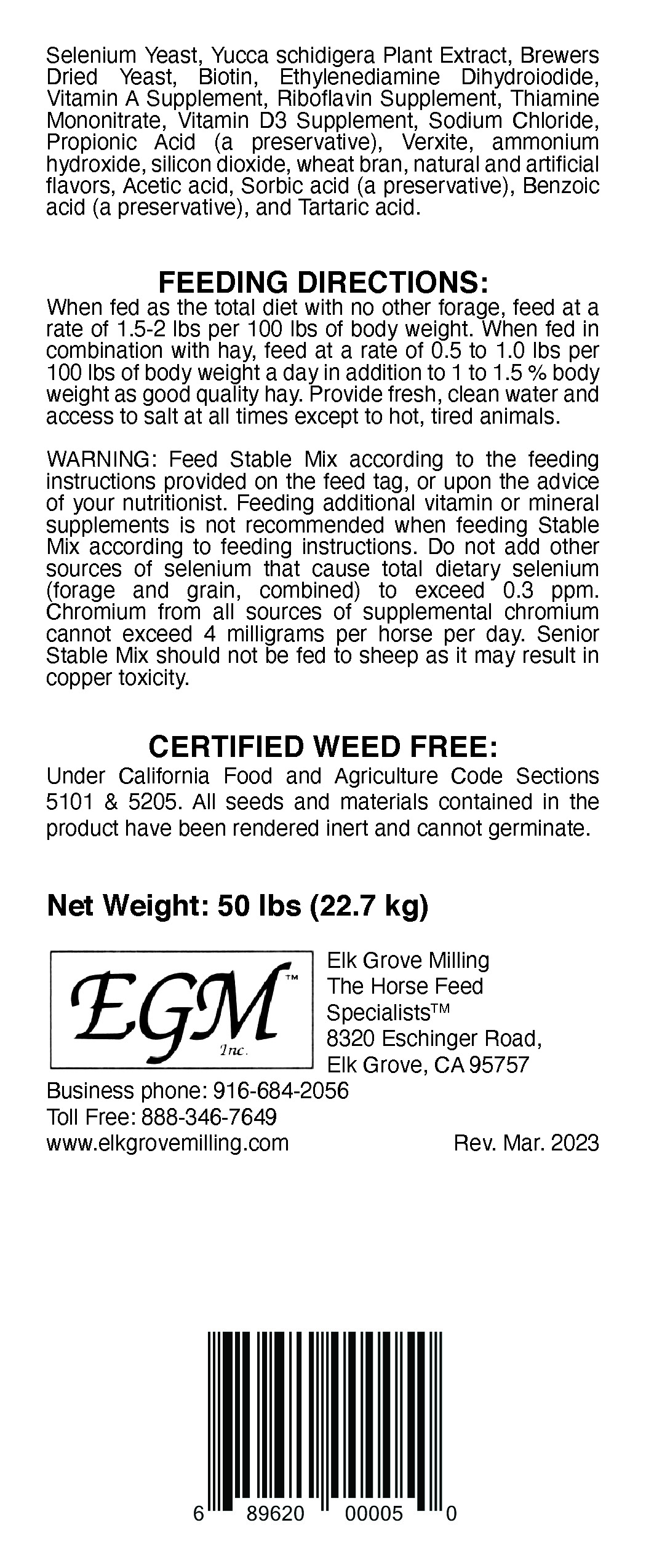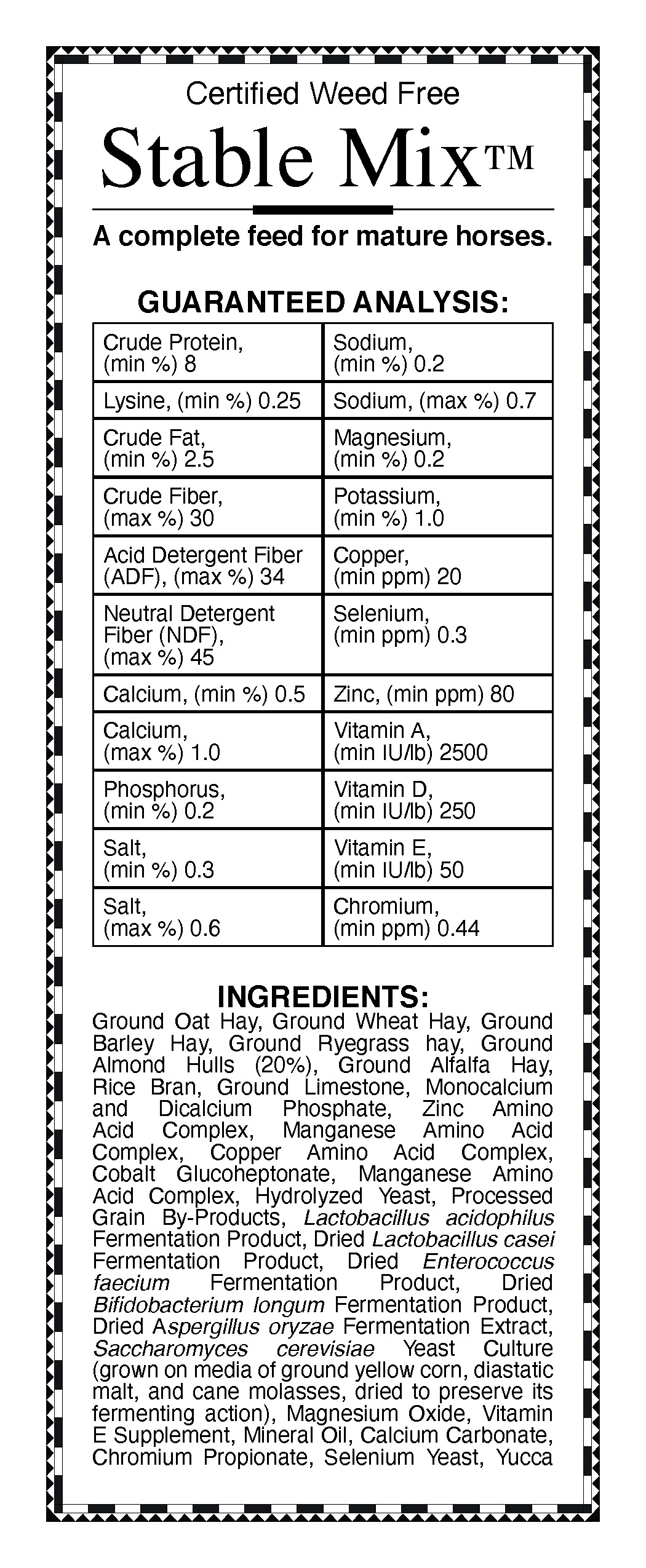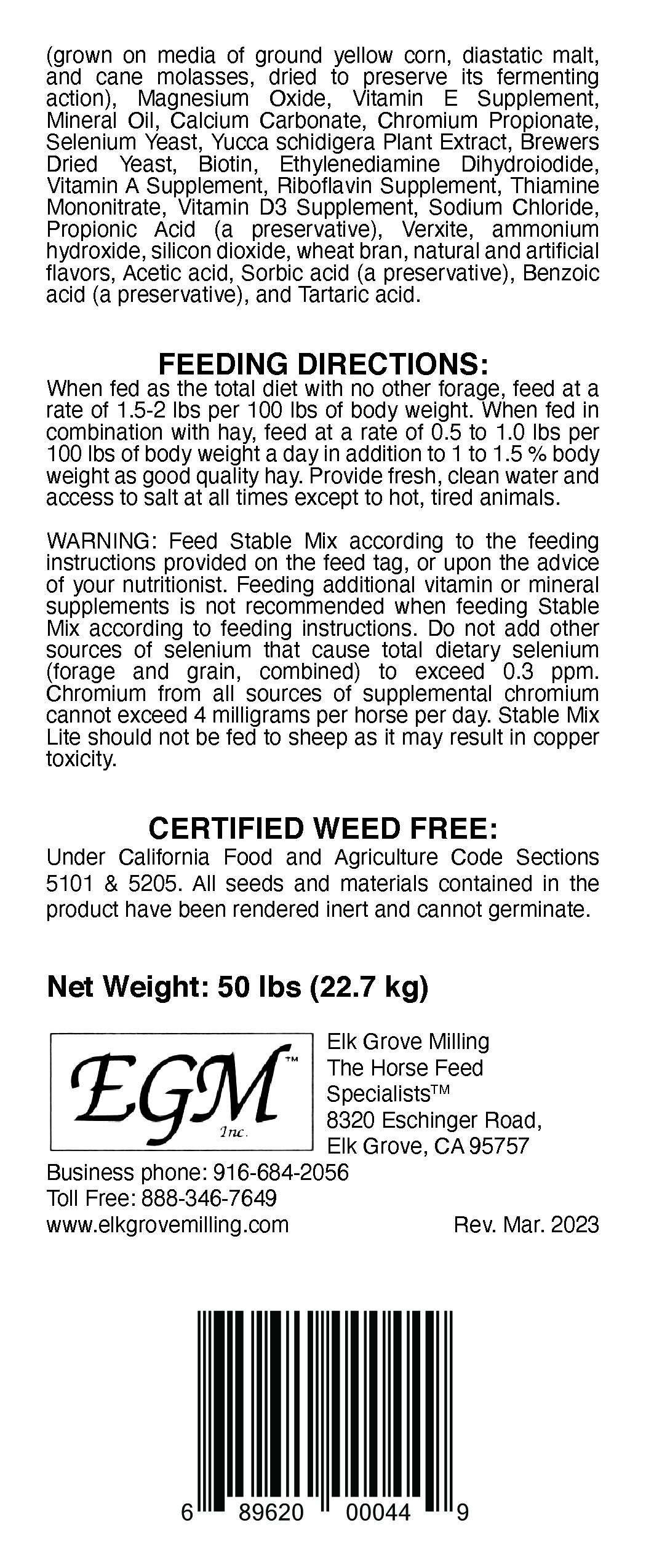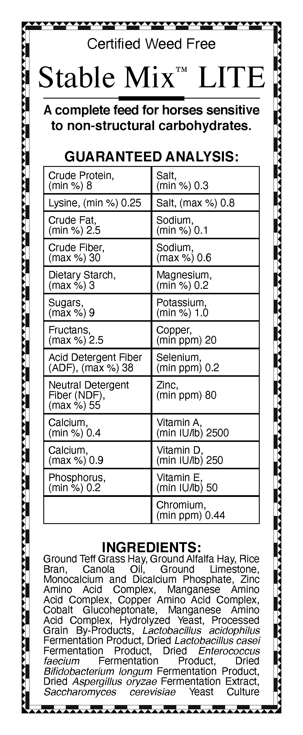 Elk Grove Milling’s Stable Mix LITE is a complete, TEFF HAY-based pellet, meaning that it contains enough fiber when fed as directed it can safely replace the other sources of forage in your horse’s ration. Stable Mix LITE has less then 11% NSC which makes this feed suitable for horses needing low sugar/starch diets or very easy keepers. Stable Mix LITE comes with all the necessary vitamins (like Biotin) and minerals to ensure that all of your horse’s nutritional needs are met. We don’t just use any minerals- we use Zinpro Performance Minerals. These patented organic minerals are unique in the market place. This feed also contains pro-biotics, pre-biotics, and Selenium Yeast. Back-country ready, certified weed free. Add water to create an easy-to-chew mash. Contains no molasses and no corn.