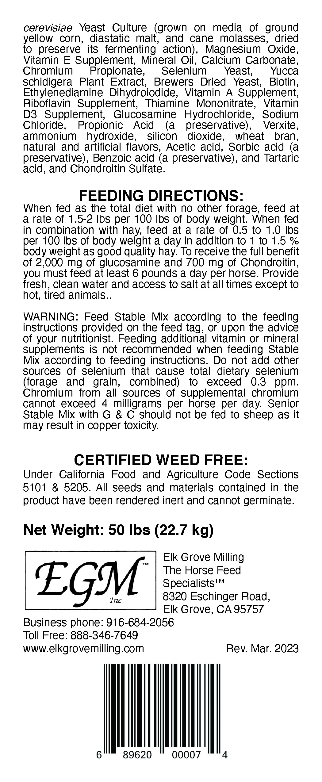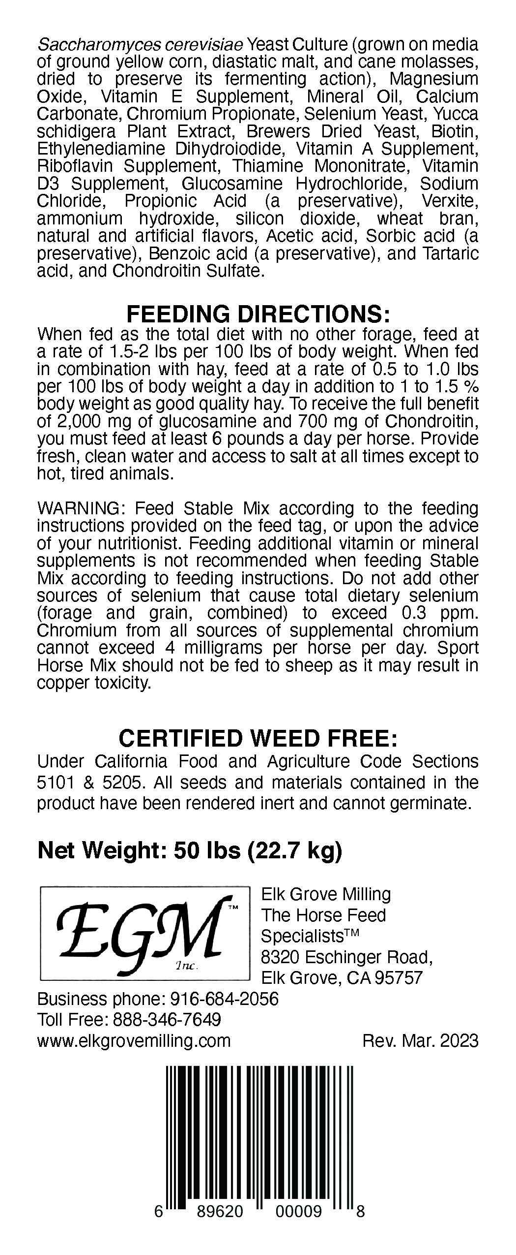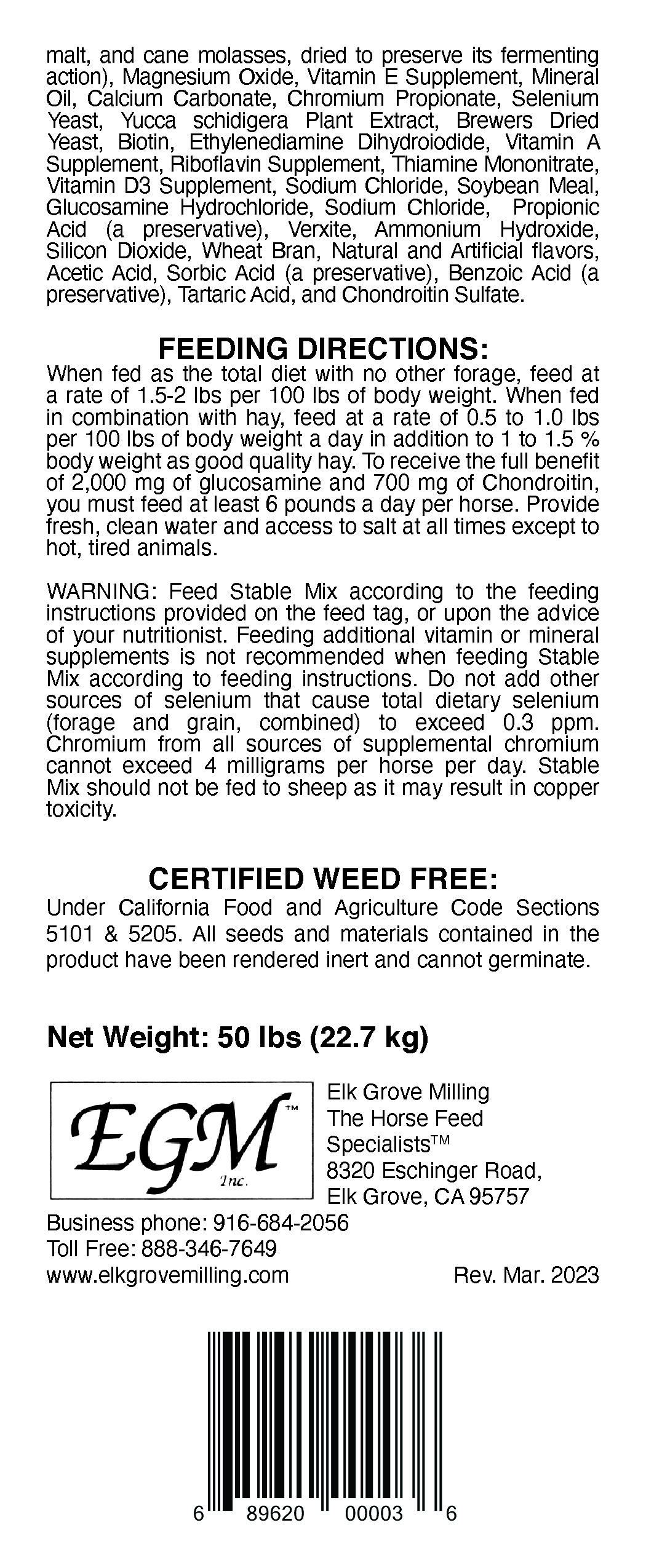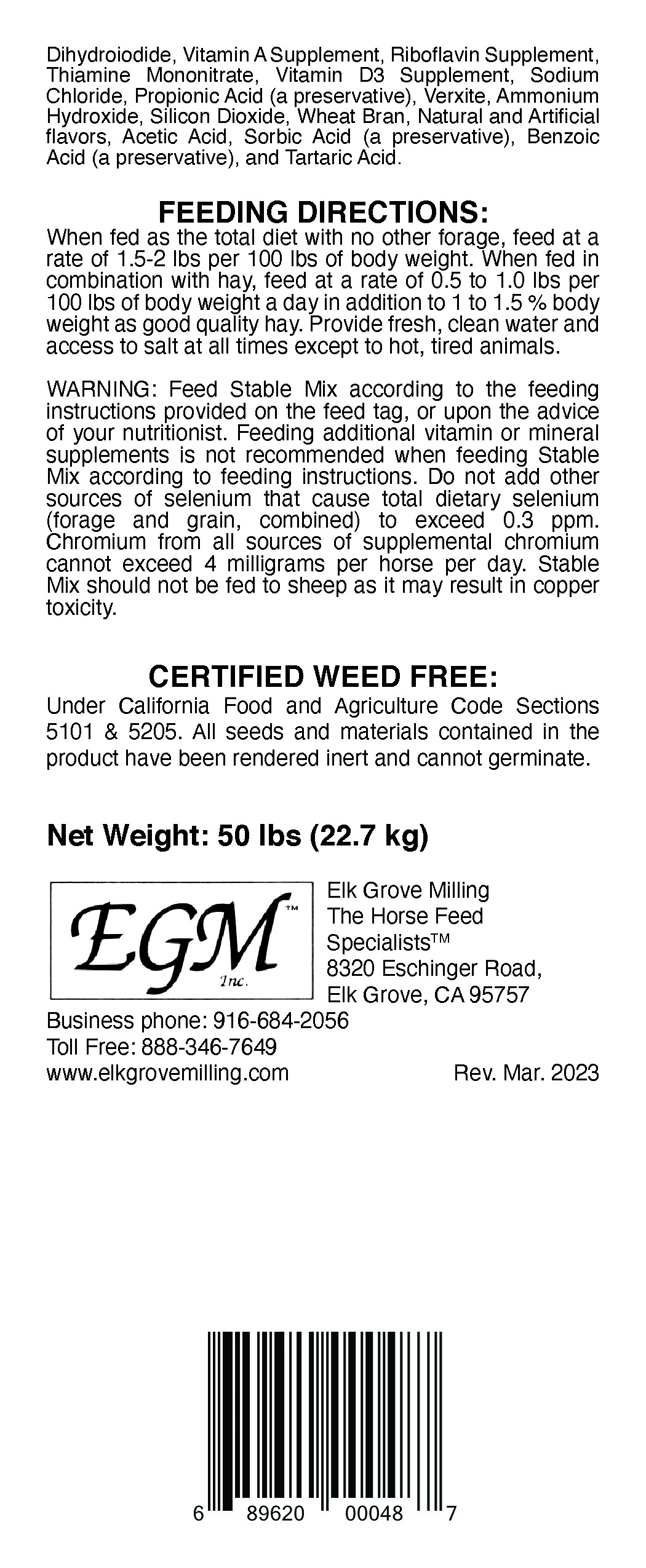 Elk Grove Milling’s Stable Mix LITE is a complete, TEFF HAY-based pellet, meaning that it contains enough fiber when fed as directed it can safely replace the other sources of forage in your horse’s ration. Stable Mix LITE has less then 11% NSC which makes this feed suitable for horses needing low sugar/starch diets or very easy keepers. Stable Mix LITE comes with all the necessary vitamins (like Biotin) and minerals to ensure that all of your horse’s nutritional needs are met. We don’t just use any minerals- we use Zinpro Performance Minerals. These patented organic minerals are unique in the market place. This feed also contains pro-biotics, pre-biotics, and Selenium Yeast. Back-country ready, certified weed free. Add water to create an easy-to-chew mash. Contains no molasses and no corn.