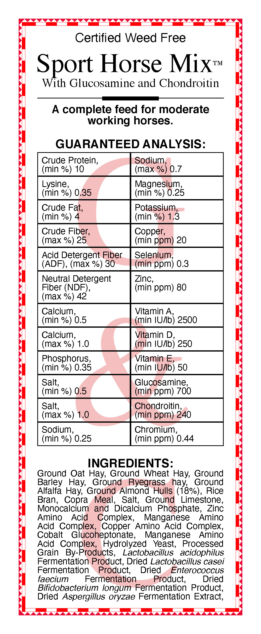 Horses in moderate work have a higher calorie and protein requirement and their bodies are subject to stresses that idle horses are not subjected to. Sport Horse Mix supports the moderately working horse regardless of discipline. Energy levels in Sport Horse Mix are elevated through the use of fat from rice bran and copra meal, not grain. This maintains a low nonstructural carbohydrate (NSC) level and reduces the risk of hot and fizzy behavior often associated with elevated NSC. Copra meal provides cool energy from coconut oil, a saturated fat. Saturated fats have been shown to spare muscle glycogen in horses, the important storage form of glucose. Additionally copra meal is high in the amino acid glutamine which helps support healing of gut tissue, an important benefit for performance horses at greater risk of developing gastric ulcers. As a complete feed, Sport Horse Mix is high fiber and is formulated to be fed without additional hay in the ration. Unlike hay, when fed as directed, Sport Horse Mix will provide your horse with all the necessary vitamins (like Biotin) and minerals insuring a balanced mineral profile for health and performance.