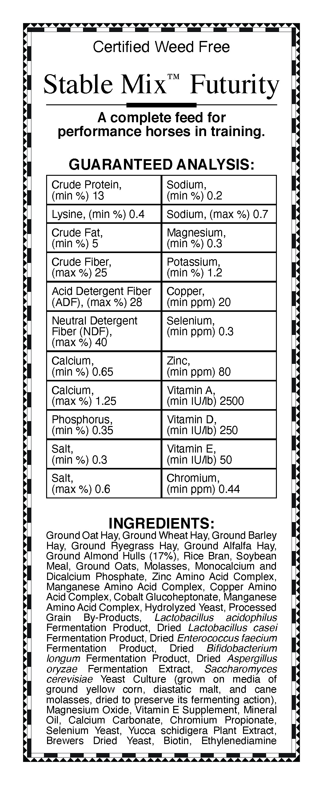 Stable Mix Futurity is a complete, forage based pelleted feed specially formulated for your developing horse in training. Young horses face major dental changes as permanent teeth are erupting which can cause discomfort and difficulty chewing. These issues in conjunction with growing bones and high energy demands can cause your horse to come across as fussy during training. Stable Mix Futurity was formulated to address these challenges and keep them focused. Futurity supplies energy from a higher fat content but does have limited molasses and high quality oats, adding the energy they need without the extra sugars. Futurity features a small 5/32″ easy to chew, smaller pellet making sure your young horse is able to consume the nutrition he needs to maintain body condition and energy. Futurity can also be soaked into a mash. The addition of prebiotics, probiotics and other premier Alltech ingredients supports the young horse’s immune system and healthy gastrointestinal system. Keeping young horses healthy and happy during training creates a more positive environment for them to grow and learn.
