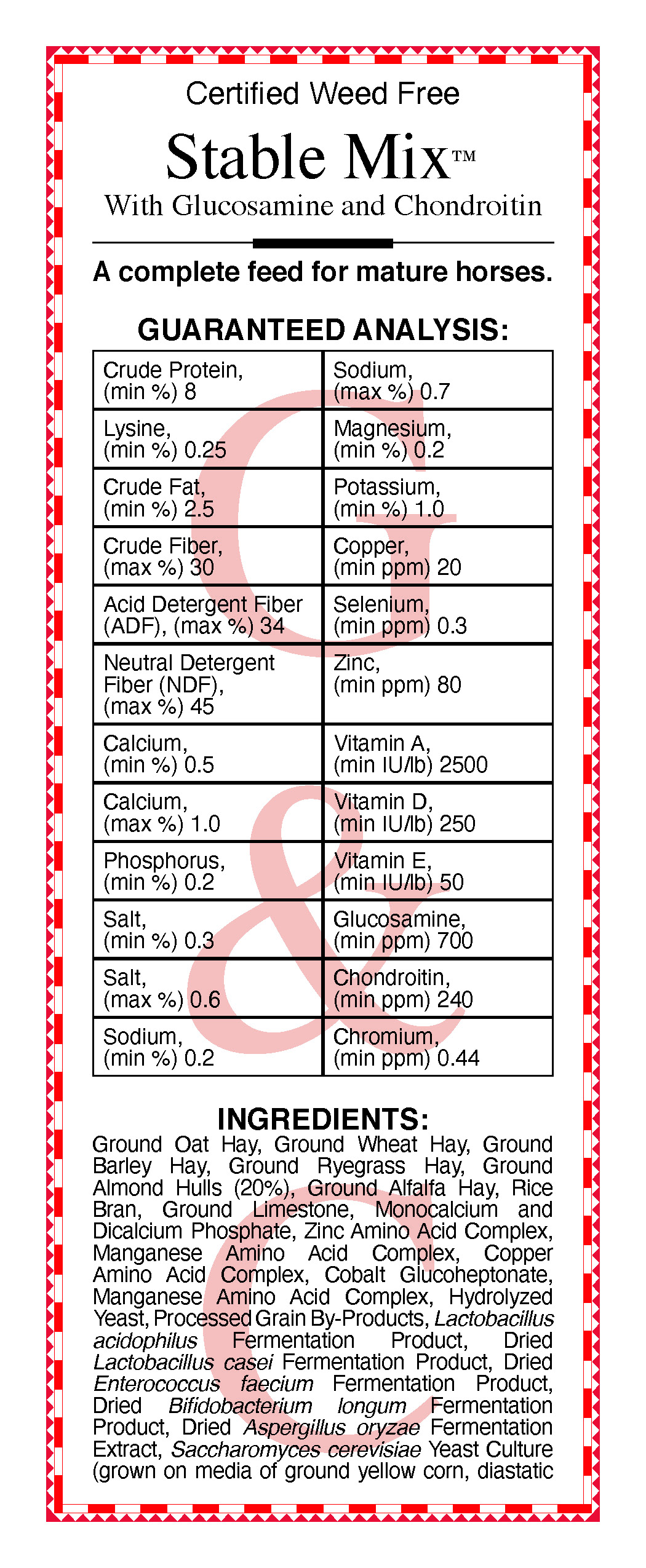 Unlike hay, Stable Mix comes with all the necessary vitamins and minerals to insure that all of your horse’s nutritional needs are met. We don’t just use any minerals we use Zinpro Performance Minerals. These patented organic minerals are unique in the market place. For more information on Zinpro minerals visit their website at www.zinpro.com