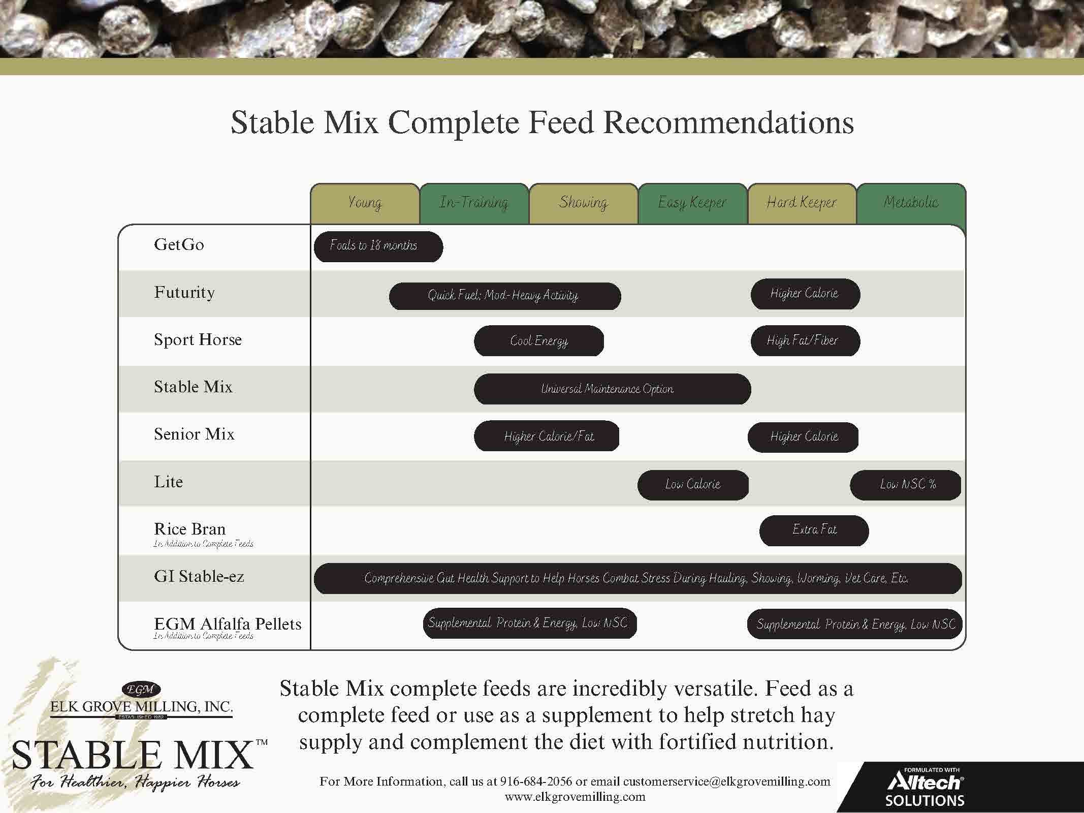 Thank you for your interest in Stable Mix™ and Elk Grove Milling, Inc. We invite you to visit our mill and feed store located just outside of Elk Grove at: